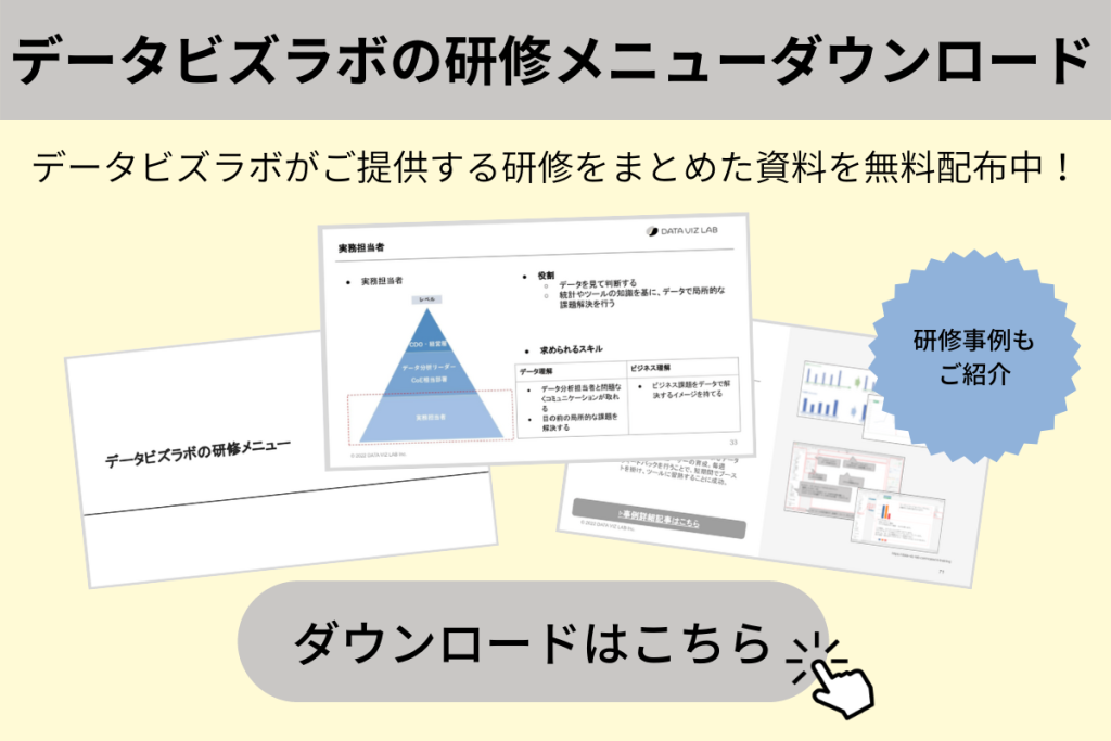 インサイト発見に寄与するダッシュボードを作成するためのデータビジュアライゼーションスキルを座学で学んだ後、グループワークでダッシュボード作成とフィードバック両方を実践してダッシュボードの目利き力とデザイン力を向上するトレーニングです。